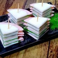 - 5 4、3、ハムの順に重ね、楊枝で4ヶ所刺して止めた後、十字に4等分に切って完成です。