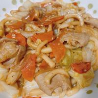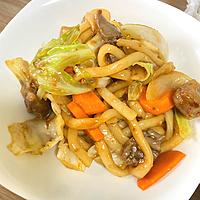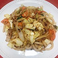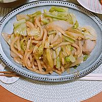 - 6 中火のまま、1、2を入れ炒め、キャベツがしんなりしたら、うどん、4を入れ、炒め合わせます。