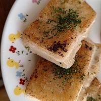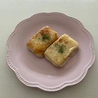 - 1 フライパンに有塩バター、すりおろしニンニクを入れて中火で熱し、にんにくの香りが立ったら切り餅を入れて4分程両面を焼きます。