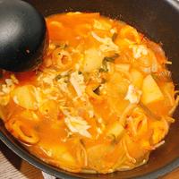 - 5 中火で3分程炒めたら調味料とキムチを加え、ひと煮立ちさせ、じゃがいもが柔らかくなってきたら2を加えます。