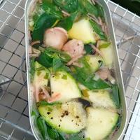キャンプ朝食に実家産ズッキーニとウインナー等、前日の余り食材で作りました。
