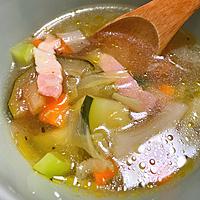 - 4 薄切りハーフベーコンに焼き色がついたら、1を入れて、野菜がしんなりしたら、お湯を入れて5分程煮ます。