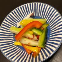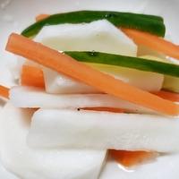 大根・きゅうり・パプリカ・にんじんをトータル260gくらいで作りました。たべれぽ参考に、にんじんと大根はレンチンしてから漬けました。