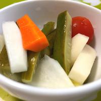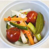 何回か作って分かった事は、私はレンジよりもお鍋で火入れして、そこにかたい人参から順に大根などを入れ、パプリカ、爪楊枝で穴を開けたミニトマト、胡瓜は最後で混ぜてます。