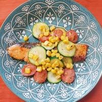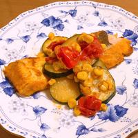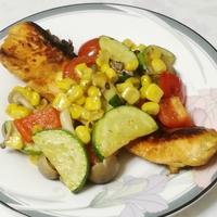 野菜は、ズッキーニとコーンを先に焼いて、出来上がるギリギリでトマトを入れたほうが良いと思います。