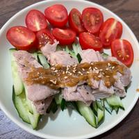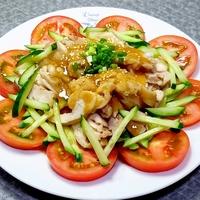レンジだけで手軽に調理できる時短レシピなのに、鶏もも肉がホロホロと崩れるほど柔らかく仕上がります。生姜が効いた茹で汁は驚くほど美味しく、スープにしても絶品。タレは片栗粉でトロッと絡み、ゴマの風味豊かな仕上がりに。きゅうりやトマトを添えて彩り良く、暑い日にもぴったり。5歳のお子様でもおかわりするほどの美味しさです。