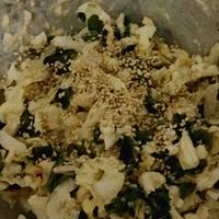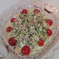 - 4 1の水気を絞ります。そこに2、シーチキン、3を加え、さっくりと混ぜ合わせたらお皿に盛りつけ完成です。