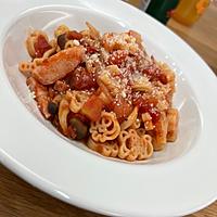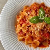 モチモチの食感のパスタにベーコンの旨味とトマトの酸味が絶妙に絡み合う一品です。トマト缶とフレッシュトマトを組み合わせることで、まろやかな味わいに。しめじやほうれん草、アスパラなどのお好みの野菜を加えても美味しく、牛乳を少し加えると酸味が優しくなります。子供からも好評で、リボン型のファルファッレを使うと見た目も可愛らしく仕上がりますよ。