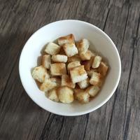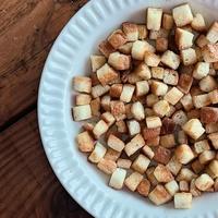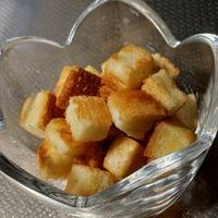 食パンを買ってきても、いつももて余し気味になるので、その時はこのクルトンを作っています。今日は6枚切りのパン3枚分を塩味で作りました。美味しいので、直ぐに無くなります😋