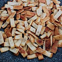 6枚切りで少し大きめにカットしました。熱いうちに塩で味付けし、ポタージュのトッピングとして食べました。