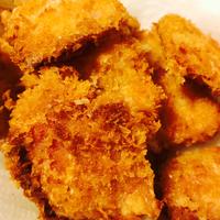 - 3 薄力粉、溶き卵、パン粉を順につけて、180度の揚げ油で1分ほど揚げたらできあがりです。チーズが溶け出す前に上げてください。