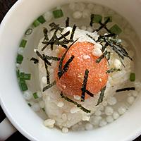 - 3 お皿に2を移し、明太子、刻みのり、お湯を注ぎ、天かすを乗せて完成です。