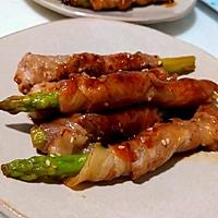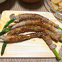 - 2 アスパラガスに1の1枚を斜めに巻きつけます。同様に7本作ります。