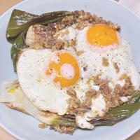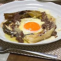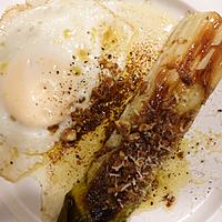 - 4 別のフライパンにEVオリーブオイルを入れて中火で加熱します。卵を入れて底に焼き色がついたら塩をふり、水を入れ、蓋をして蒸し焼きにし、お好みの焼き加減で火から下ろします。