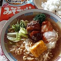 サッポロ一番みそラーメンが大好きです🎵野菜はブロッコリーレタスキムチ、ネギ、コーン🌽(見えない…)です!玉子焼き、ミートボール、たこ焼き🐙…。✨