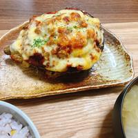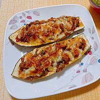- 5 なすの皮に4をつめ、スライスチーズをのせ、オーブントースターで20分ほど焼きます。