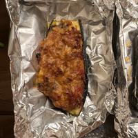 (茄子の中に下からミートソース→マッシュポテト→ミートソース→チーズ)