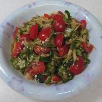 - 2 ミョウガと、ヘタを取ったきゅうりは千切りにします。ミニトマトはヘタを取り4等分に切ります。