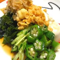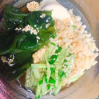 冷凍オクラ、きゅうり、乾燥わかめ、天かす、ザーサイ。スプーンで具を混ぜて食べました。食べ応えあるので、ダイエットの時も良さそう。