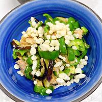 - 2 フライパンにごま油をひいて中火で熱し、1、ツナ水煮を入れ、ピーマンがしんなりするまで2分程炒めます。