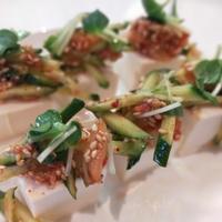 チャンジャを使った冷奴のレシピです。 いつもの冷奴にひと手間くわえてちょっとおしゃれに仕上げました。 韓国風な味付けでチャンジャときゅうりを合わせて豆腐にのせるだけの簡単調理です。 お酒に良く合いますよ。