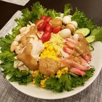 カニカマ、モッツァレラチーズ、ブロッコリー、ゆで卵など、冷蔵庫の残り物で。定番のゴマドレで美味しいです。