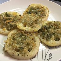 れんこんをオリーブオイルで先に炒めチーズじゃこ+マヨネーズをのせて焼きました。
