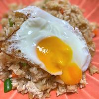 - 5 中火に熱したフライパンにサラダ油をひき、卵を入れ、白身が固まるまで3分程焼き、火から下ろします。