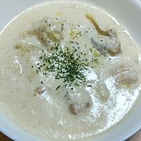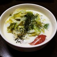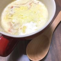 スープはスゴイダイズ(牛乳の代用)300gとコンソメ小さじ1と塩胡椒で作りました。