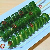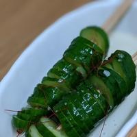 - 1 きゅうりは半分の長さに切り、割り箸を刺し、回しながららせん状に切り込みを入れ割り箸に沿って広げます。