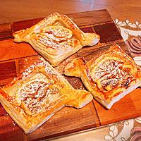 - 3 パイシートを3mm程度の厚さになるまで伸ばして2等分に切ります。正方形にして、切れ込みを入れたら卵黄を塗り、中心に向かって角を折りたたみフォークで穴を開けます。