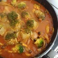 勝手にアレンジ。家にあった他の野菜と一緒にトマトソースで煮込みました。ブロッコリーミートボール、見た目が可愛い。次はレシピ通りのソースで作ってみます。