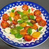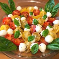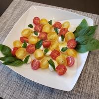カラフルなミニトマトと、ミニモッツァレラチーズで作った、水玉カプレーゼです。オリーブオイルと塩こしょうのとてもシンプルな味付けですが、バジルがアクセントになり、とても美味しいです。可愛らしく鮮やかなので、おもてなしにもおすすめです。是非お試しください。