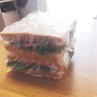 - 5 マヨネーズを塗った面に2、3、1の順にのせ、マスタードを塗った面を下にして食パンを重ねます。ラップで包み、食べやすい大きさに切ってラップを外します。