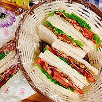 ベーコン、レタス、トマトを挟んだ、BLTサンドイッチはいかがでしょうか。具材がたっぷりで、食べ応え十分なサンドイッチです。ベーコンはカリカリ焼くと、食感と風味がよく、一層おいしくなりますよ。ぜひお試しくださいね。