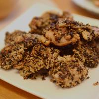 鶏もも肉にごまをたっぷり付けて焼き上げました。仕上げにごま油を回し入れる事で一層風味もよく、鶏もも肉にしっかり下味がついているので、ソース等何もつけずにそのまま美味しく頂けます。お酒にもよく合いますので、是非お試しくださいね。