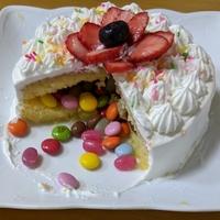 ケーキをカットすると、ジャラジャラとお菓子が出てくる!とってもパーティー向けのケーキです。 中に入れるお菓子はお好みで沢山入れると、とても盛り上がりますね! お子様はもちろん、大人もとても楽しめるケーキです。