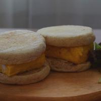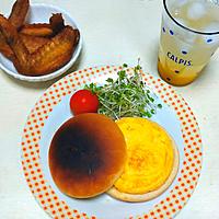厚焼きホットケーキの型を使って、巻かずに厚焼きたまごバーガーに。卵は一個で調味料減らして上手く出来ました☆
