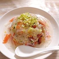 - 4 ごはんがパラパラになったら1と塩こしょうを加えて中火で炒め、お皿に盛り付けます。