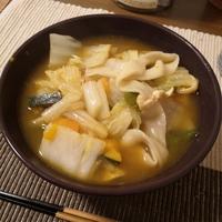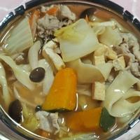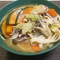 ほうとう作りました。味噌味が食べたくなってしまい、しょう油から味噌へ💦油揚げなくてお肉も入れました💦