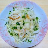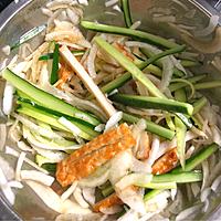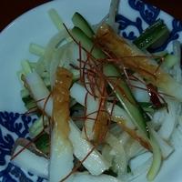 - 1 新玉ねぎは皮をむいて繊維に垂直の方向に薄切りにし、水にさらします。きゅうりは薄切りに、ちくわは半分の長さの千切りにします。