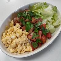 - 5 ごはんを盛った器に、サニーレタス、トマト、2、4を盛り、刻みのりを乗せて完成です。