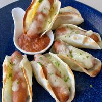 - 4 餃子の皮に1、チョリソーソーセージをのせて包みます。同じようにに5個作ります。