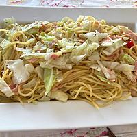 - 6 1のゆで汁を90ml入れて弱火でなじませ、1のスパゲティを湯切りして加え、混ぜながら加熱します。