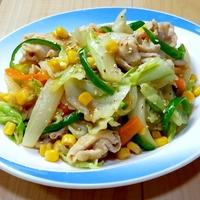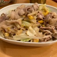 豚こま肉130g、キャベツ1/4個、コーン100g、もやしの代用として玉ねぎ1/4個で作りました。