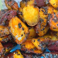 バターの贅沢な香りとコクがあり、ホクホク食感が魅力の大学芋です。揚げないのでヘルシーなのに、さつまいもの甘みにハチミツと醤油の甘じょっぱさが絶妙にマッチ。黒ごまの香ばしさが全体を引き締め、レンジを使って手軽に作れるのも嬉しいポイント。お弁当のおかずやおやつにぴったりで、子供たちにも大人気のレシピです。