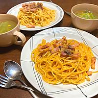 - 2 フライパンにブロックベーコン、オリーブオイルを入れて強火で加熱し、ブロックベーコンから脂が出てきたら中火にして焼き色が付くまで炒め、火から下ろします。