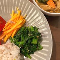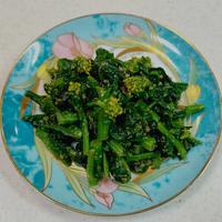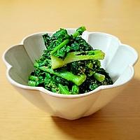 7歳娘のリクエスト‼️菜の花が売っていなく😅のらぼう菜で💓醤油は、減塩醤油を使用。レシピ半分の醤油とラカントs(砂糖)を混ぜレンジで温めてから、合えました‼️