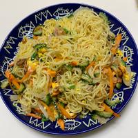 ゴーヤが半分残っていたので、焼きそばでアレンジしました。塩味、黒胡椒で味付けして、フライドニンニクのバター味を混ぜたら、より一層美味しくなりました。 家族にも、初めての焼きそばで、とっても美味しいと、好評でした!