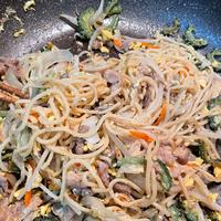- 7 にんじんがしんなりしてきたら中火のまま、中華麺、(A)、かつお節の順に入れ炒めます。